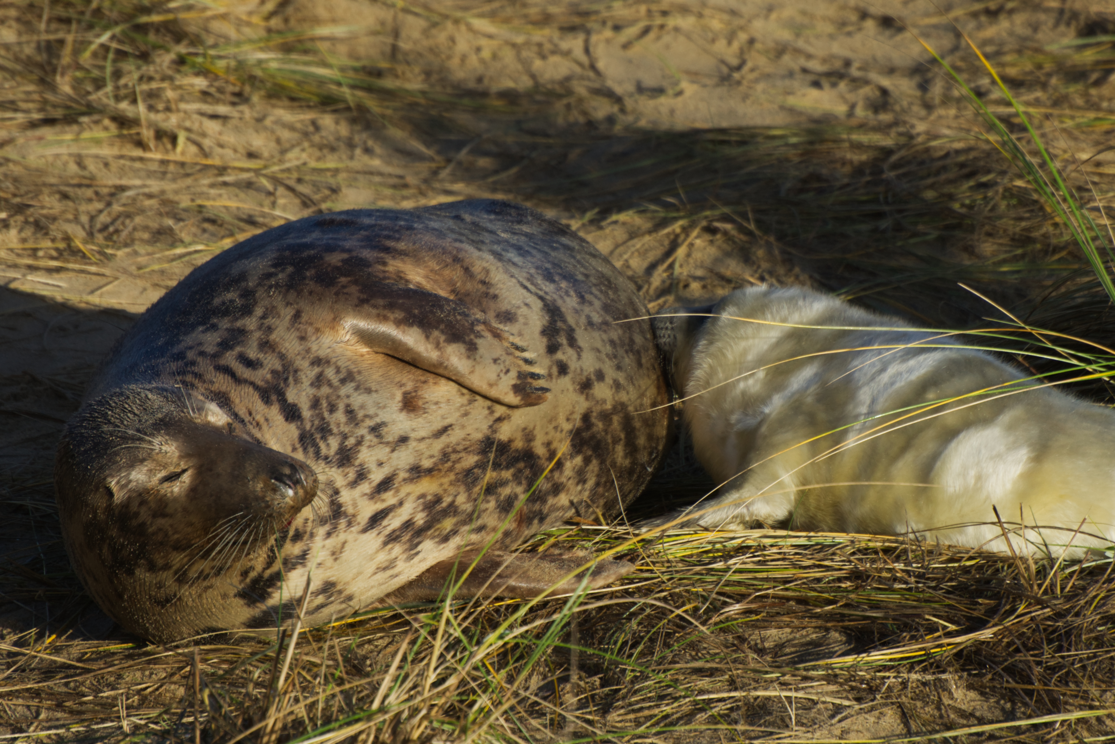 After a cosy night in Blakeney, we traveled on to Horsey Gap for seals experience number 2! No boats needed at Horsey, just park up (pay for your parking ticket) and wander a few yards along the path, up and on to the dunes and you’re presented with a beach load of seals. The Friends of Horsey Seals do a wonderful job manning the car park, setting up the paths and keeping a watchful eye on seals and visitors to ensure that the seals not disturbed and can come back every year to their birthing and nursing grounds.